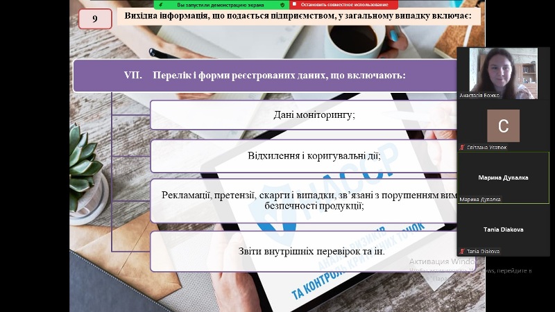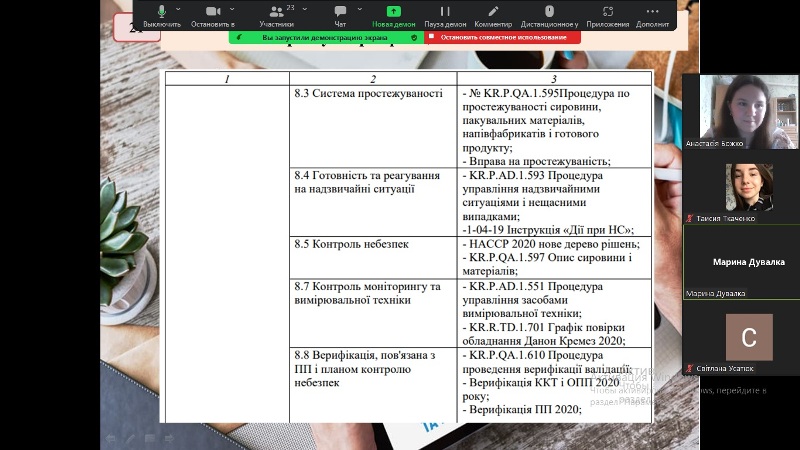 Заняття з дисципліни «Основи управління якістю та безпечністю харчових продуктів. Модуль 2. НАССР і системи управління безпечністю харчової продукції» відбулося в режимі Zoom-конференції для здобувачів четвертого курсу освітнього ступеня «Бакалавр» спеціальності 181 «Харчові технології», освітньо-професійної програми «Технологічна експертиза та безпека харчової продукції» денної форми навчання.