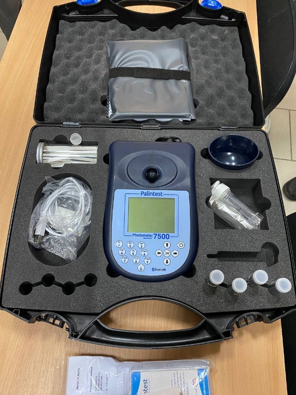 Дослідження якості води проводили за допомогою мультипараметричного фотометру 7500 Palintest. Цей прилад призначений для контролю якості як питної, так і технічної води. Фотометр 7500 – компактний і надійний, є ідеальним інструментом для фахівців водного господарства. За його допомогою можна визначати вміст у воді хлоридів, нітратів, сульфатів, фосфатів, розчиненого кисню тощо. Також фотометр 7500 Palintest забезпечує можливість швидкого визначення колірності, лужності та жорсткості води. Визначення цих параметрів надзвичайно важливе для досліджень екологічного спрямування.