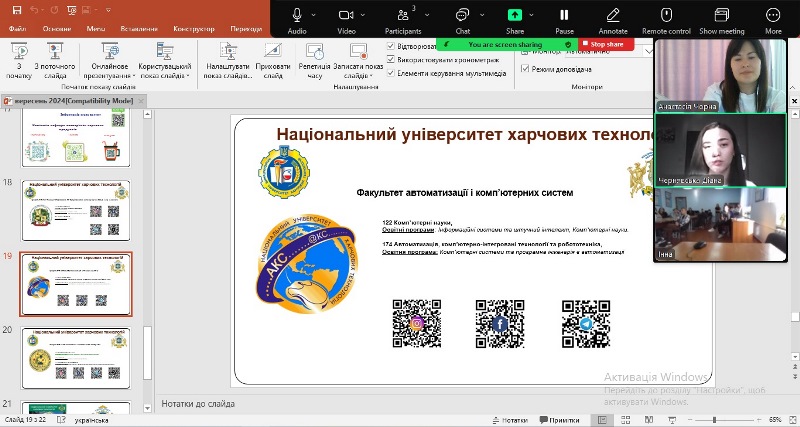 23 вересня доцентка кафедри експертизи харчових продуктів Анастасія Чорна та здобувачка третього курсу Діана Чернявська, яка навчається за освітньо-професійною програмою «Технологічна експертиза та безпека харчової продукції», провели онлайн-зустріч із учнями 8-11 класів Журавненського ліцею Хмельницької міської ради.