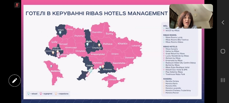 Спікерка надала ґрунтовну інформацію про діяльність мережі готельних підприємств, особливості організації управління готельним бізнесом, а також охарактеризувала засоби розміщення мережі: заміські і міські готелі, апарт-готелі та глемпінги, що знаходяться в мальовничих куточках України.
