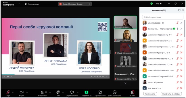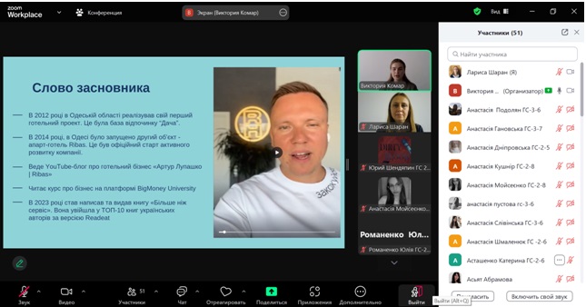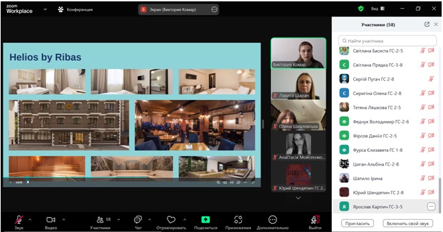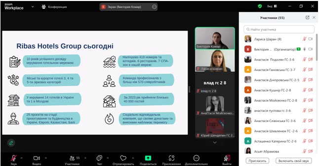 Гостьовий лекторій відбувся у комплексному форматі: першу частину зустрічі лекторка присвятила ознайомчій доповіді про особливості діяльності Ribas Hotels Group в Україні та за її межами; друга частина була у форматі онлайн-сесії «Запитання і відповідь». Здобувачі та викладачі кафедри мали можливість задати конструктивні запитання щодо функціонування мережі готельних підприємств Ribas.