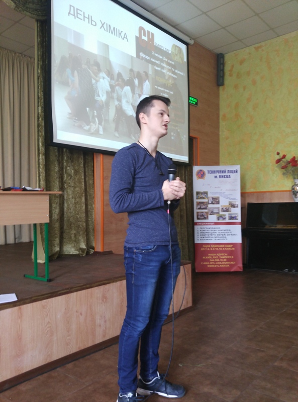 Вже стало традицією проводити майстер-класи для ліцеїстів. Цього разу майстер-клас продемонстрували студенти 3-го курсу факультету біотехнології та екологічного контролю Дмитро Фільчук та Андрій Буров, які захопили присутніх розповіддю про хімію, про її роль у житті кожної людини, країни в цілому, про те, як хімія може стати головною справою всього життя. Для цього треба дуже небагато – просто любити цю науку. А вона віддячить яскравими миттєвостями, наповненими новими знаннями, знахідками і відкриттями. Також майбутні абітурієнти дізналися, що за період навчання на факультеті біотехнології та екологічного контролю, студенти отримують всі необхідні для подальшої професійної кар’єри знання, оскільки підготовку майбутніх хіміків здійснюють провідні фахівці в цій галузі, які мають значний практичний досвід.