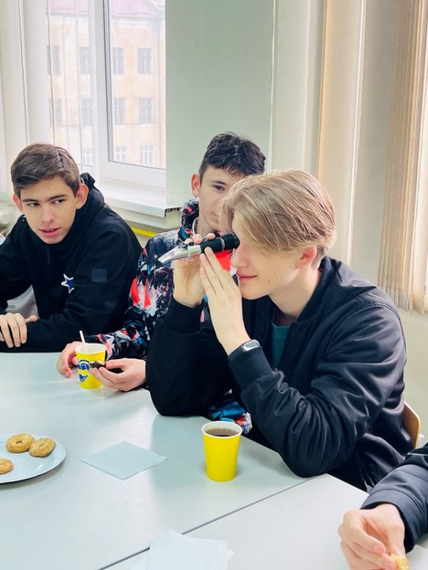 Майстер-клас на кафедрі розпочали з дегустації борошняних кондитерських виробів і чаю, а далі гості власноруч визначили масову частку вологи в меді, з’ясували, чи наявні лужнореагуючі домішки в борошні, за допомогою мікроскопа навчилися відрізняти кукурудзяний крохмаль від картопляного.