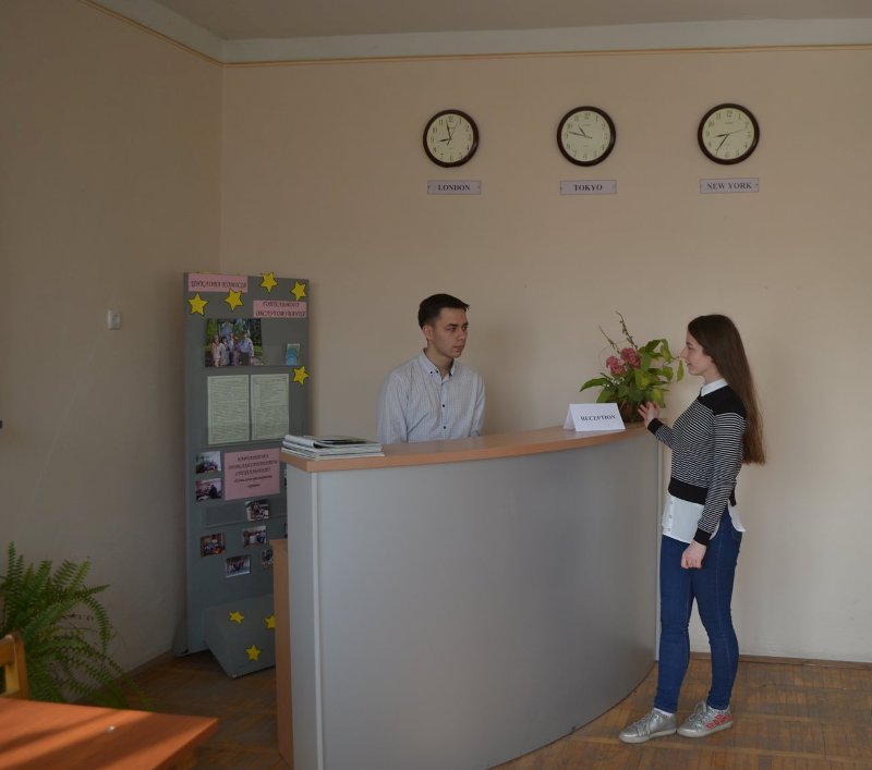 5 квітня студенти знайомилися з роботою служби прийому і розміщення. У процесі обслуговування клієнти найбільше взаємодіють з персоналом цієї служби - отримують інформацію про готель, здійснюють бронювання місць (за умови відсутності служби бронювання як окремої структурної ланки), забезпечується поселення, оплата послуг, послуги під час перебування у готелі. Водночас, служба прийому і розміщення коригує роботу інших служб, пов'язану з безпосереднім обслуговуванням клієнтів - служби бронювання, обслуговування номерного фонду, харчування, здійснює аналіз заповнюваності номерів за поточну добу, контролює оплату клієнтами послуг готелю, забезпечує ведення технічної документації, пов'язаної з обслуговуванням гостей та ін.