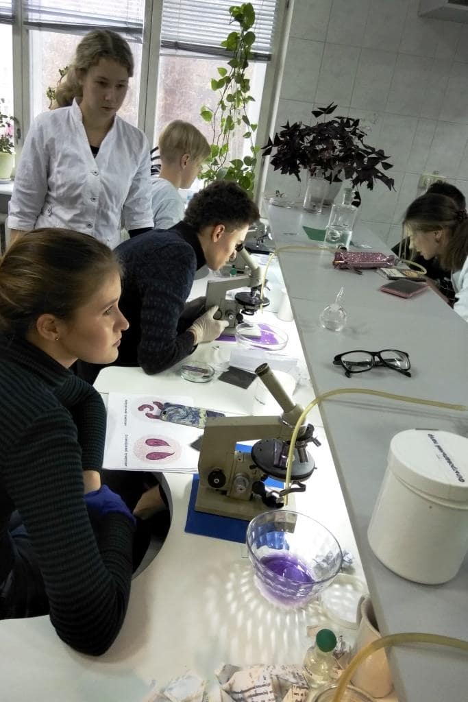 Крім цього, учні мали можливість спостерігати за тим, як майстерно та легко викладач виготовила мазок крові, налаштувала мікроскоп і знайшла потрібні клітини. Пізніше юні імунологи власноруч виготовили та пофарбували мазок крові, після чого почали активно мікроскопіювати отримані мазки, сперечаючись, хто віднайшов найунікальніші клітини.