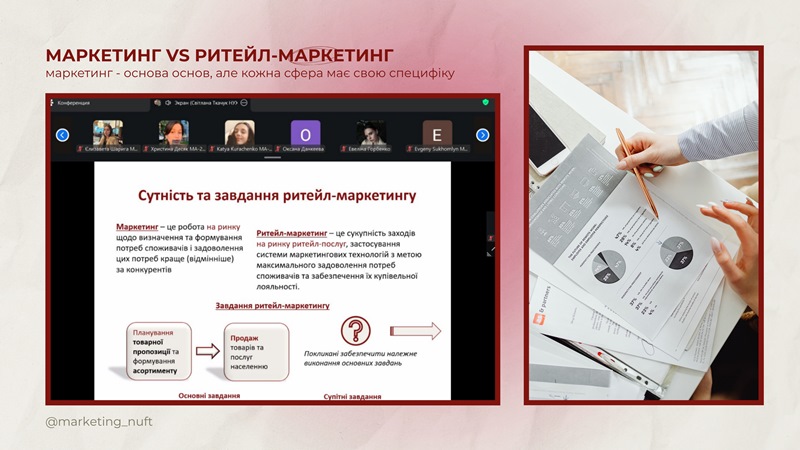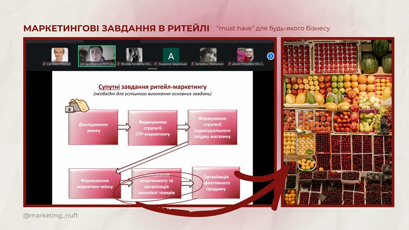 Основа основ, яку майбутні маркетологи вивчали в дисципліні «Маркетинг», була подана крізь призму ритейлу. Виявляється, маркетинг-мікс ритейлера – це не просто «4 Р», а сукупність більш розширених елементів, що враховують специфіку сервісної сфери та особливості роздрібної торгівлі. Підвищену цікавість викликали дискутивні питання формування стратегії STP-маркетингу ритейлу: від класичного до сучасного поглядів, а також альтернативний фреймворк «Jobes to be Done», який просувається маркетинговими практиками. Заслуговує на увагу і практичний підхід застосування концепції близькості ритейлера до клієнтів, що максимально враховує нюанси ситуативного профілю здійснення покупки.