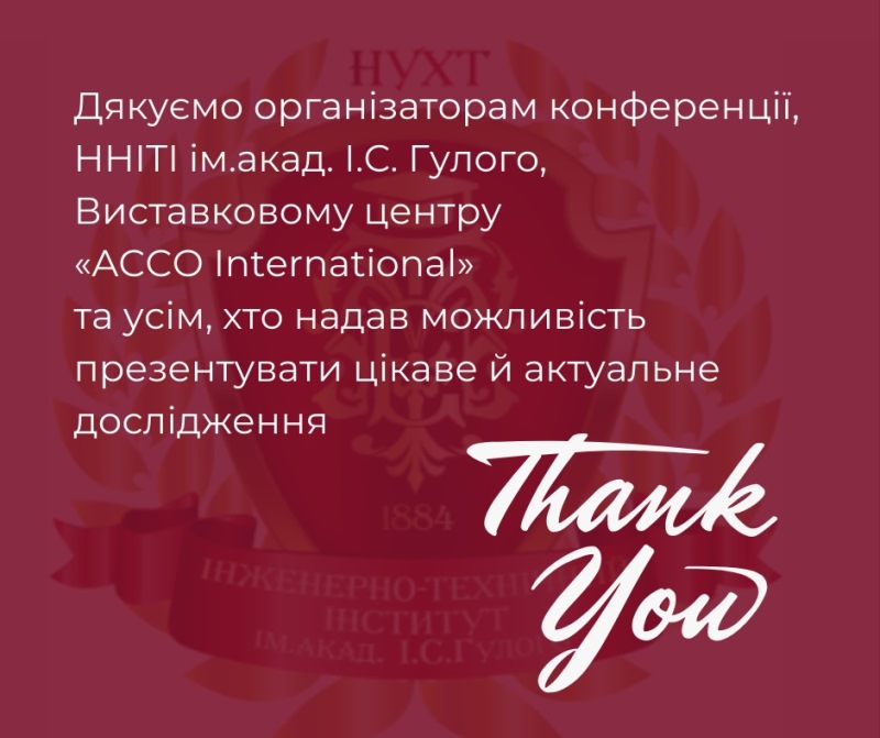 Викладачка вдячна організаторам конференції – колективам Навчально-наукового інженерно-технічного інституту ім. акад. І.С. Гулого і виставкової компанії «ACCO International» та усім, хто надав можливість презентувати цікаве й актуальне дослідження.
