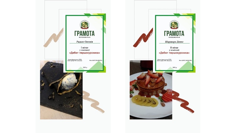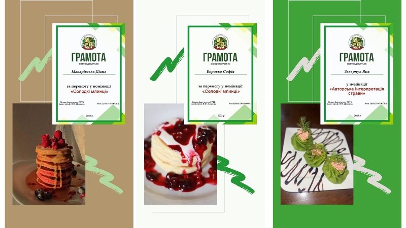 Номінація «Солодкі млинці» – Софія Боровко (група ХЧ-3-1) з пишними та ніжними японськими повітряними млинцями, Діана Макарівська (група ГС-3-4) з панкейками з солоною карамеллю та замороженими фруктами.