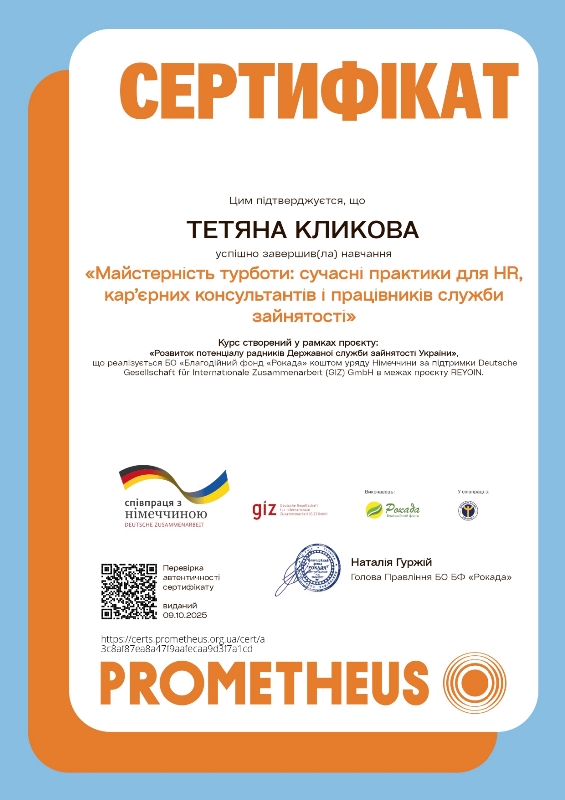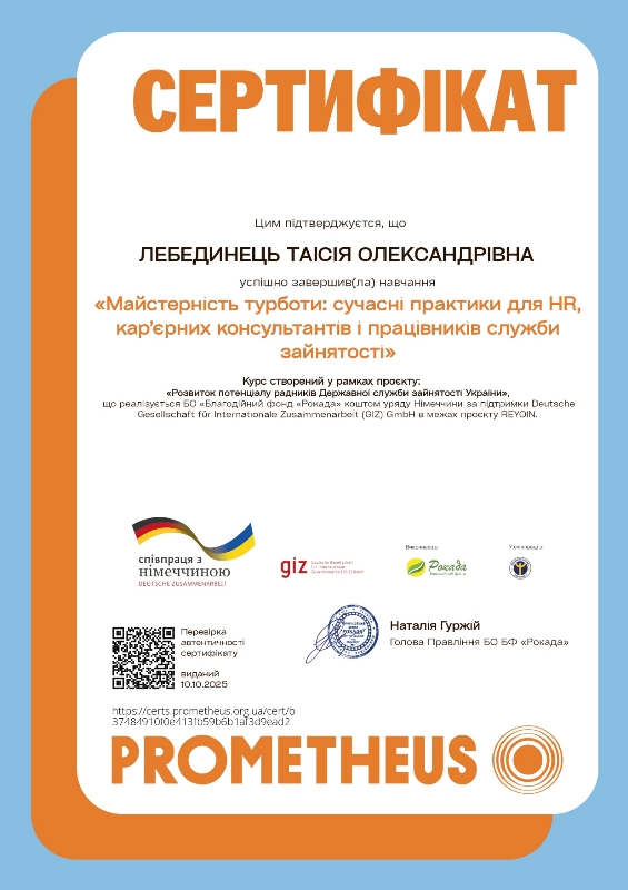 У жовтні 2025 року студентки освітньо-професійної програми «Менеджмент персоналу», другокурсниці Тетяна Кликова, Інна Остапець (група МП 2-8а) і третьокурсниці Юлія Сауткіна (група МП 3-8) та Таісія Лебединець (група МП 3-9а) взяли участь у навчанні на платформі Prometheus. У межах дисциплін «Клієнторієнтованість бізнесу», «Соціально-економічна безпека» та «Економіка праці та соціально-трудові відносини» вони успішно пройшли професійний курс «Майстерність турботи: сучасні практики для HR, кар’єрних консультантів і працівників служби зайнятості» та отримали іменні сертифікати.