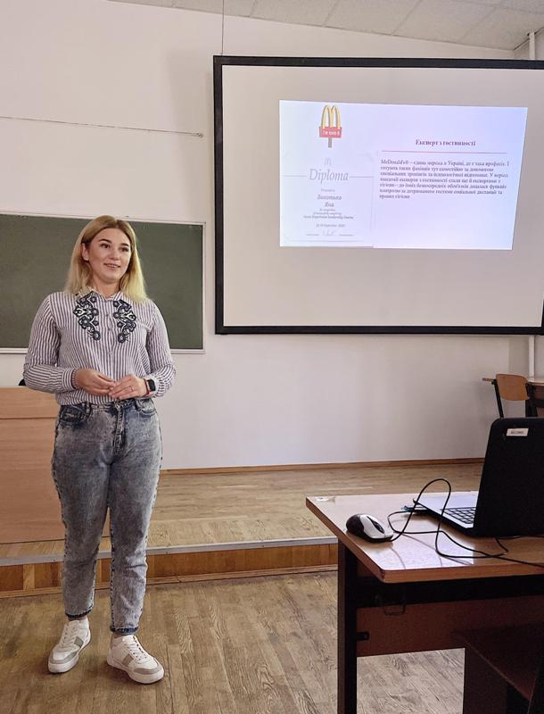 У рамках вивчення дисципліни «HR-навігатор» до здобувачів освітньо-професійної програми «Менеджмент персоналу» Навчально-наукового інституту економіки і управління НУХТ завітала Яна Бокотько, сертифікована експертка з гостинності всесвітньовідомої мережі ресторанів швидкого харчування McDonald’s. Ця управлінська позиція була введена в компанії із відкриттям ресторанів нового формату «досвід майбутнього» у 2018 році, а кандидати на її зайняття, як і Яна свого часу, проходять спеціальну підготовку за корпоративною програмою «Guest Experience Leadership Course».