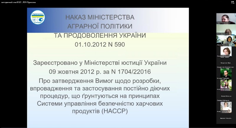 Гостьова спікерка – зовнішня стейкхолдерка, начальниця сектору оцінки відповідності підприємств харчової галузі науково-технічного центру оцінки виробництв та підтвердження відповідності систем управління ДП «Укрметртестстандарт» Ганна Бірюкова.