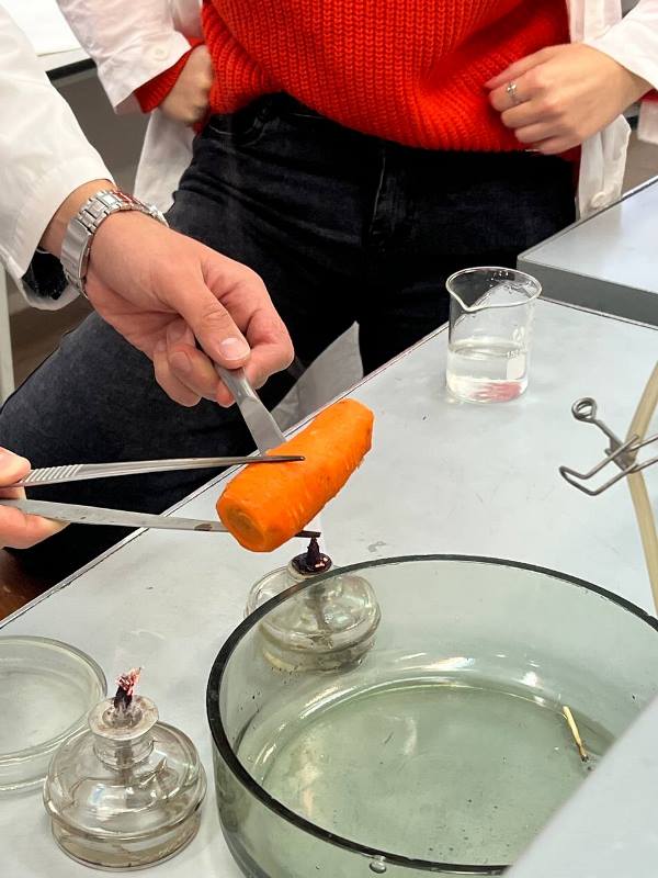 У ході заняття студенти здійснили інокуляцію експлантів моркви Agrobacterium tumefaciens. І вже через чотири тижні вони мали змогу спостерігати результат – формування пухлинних утворень на рослинному матеріалі. Це не просто цікавий експеримент, а наочна демонстрація унікальної природної системи перенесення генів: від бактерії (прокаріотної клітини) до рослини (еукаріотної клітини). Саме цей механізм ґрунтових бактерій виду A. tumefaciens став одним із ключових інструментів сучасної генетичної інженерії культурних рослин. Завдяки такій системі вчені можуть вводити нові гени у рослинні клітини, створювати трансгенні культури з цінними властивостями – від стійкості до збудників хвороб і шкідників до покращених харчових якостей.