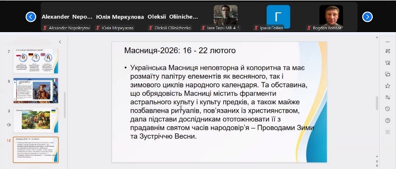 18 лютого 2026 року, за ініціативи деканки факультету готельно-ресторанного та туристичного бізнесу імені професора В.Ф. Доценка Віти Цирульнікової та завідувачки кафедри іноземних мов професійного спрямування Галини Лук’янець, професорка Наталія Науменко удруге провела відкриту лекцію «Масниця приходить – тепло із собою приводить».