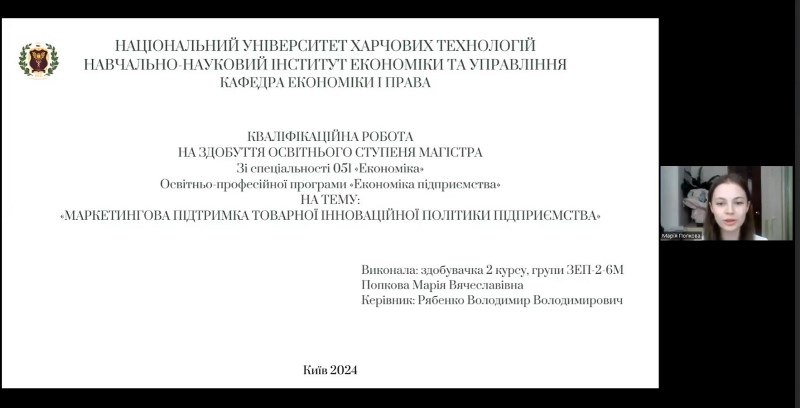 Серед здобувачів освітнього ступеня «Магістр» немає безамбітних, тому недивно, що захисти пройшли на високу рівні. Слухаючи переконливі й обґрунтовані відповіді здобувачів на численні та складні питання, викладачі й гості відчували ‒ майбутнє бізнесу в надійних руках. Тому, екзаменаційна комісія, що працювала у складі голови Київського відділення науково-технічного товариства харчової промисловості України Юрія Задніпряного, к.е.н., доцентки, в.о. завідувача кафедри економіки і права Юлії Левченко, к.е.н., доцентки, заступниці директора Навчально-наукового інституту економіки і управління Наталії Слободян та к.е.н., доцентки кафедри економіки і права Ольги Михайлик, прийняла позитивне рішення про присвоєння освітнього ступеня «Магістр» зі спеціальності 051 «Економіка» за освітньо-професійною програмою «Економіка підприємства» здобувачам денної і заочної форм навчання, серед яких Вероніка Гергало, Поліна Халіменко та Марія Попкова рекомендовані за старанність і успіхи у навчанні до вручення дипломів з відзнакою.