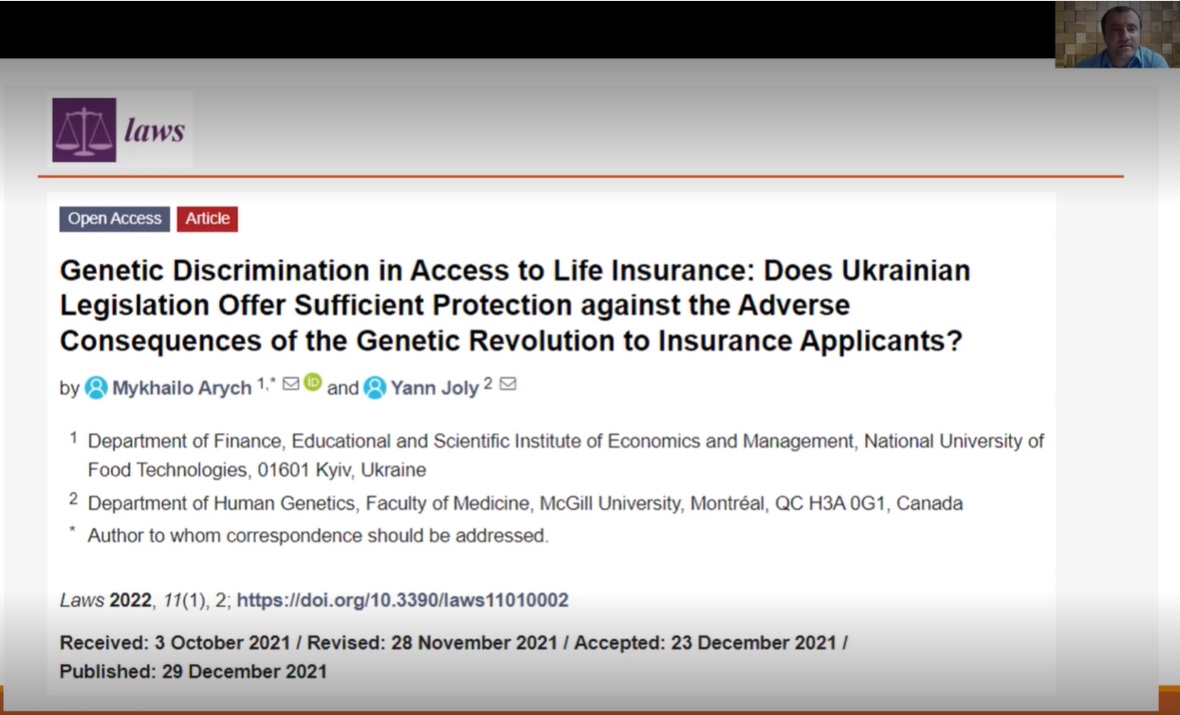 Наш викладач виступив із доповіддю та представив результати спільного з Університетом Макгілла (Канада) наукового дослідження щодо можливих ризиків генетичної дискримінації на ринку страхування життя в Україні.