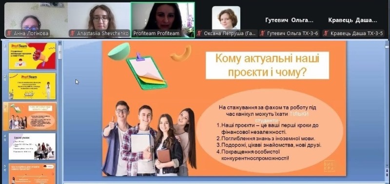 23 березня 2026 року відбулася зустріч третьокурсників спеціальності «Харчові технології» з представниками компанії «Profiteam» – провідного оператора у сфері міжнародного професійного розвитку, з яким наш університет уже багато років плідно співпрацює. Захід був присвячений питанням організації закордонної практики та стажування як невід’ємної складової підготовки сучасного конкурентоспроможного фахівця харчової галузі.