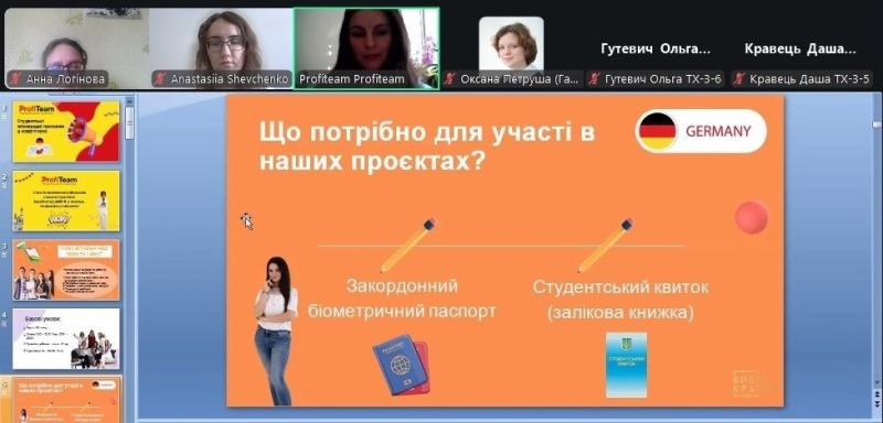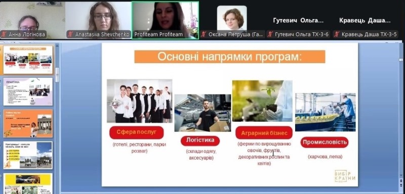 Під час зустрічі фахівчиня «Profiteam» детально ознайомила здобувачів освіти з можливостями проходження практики на передових підприємствах Німеччини. Також було вичерпно висвітлено питання побуту – умови проживання в комфортних гуртожитках або апартаментах, логістика до місця роботи та особливості медичного страхування на період стажування.