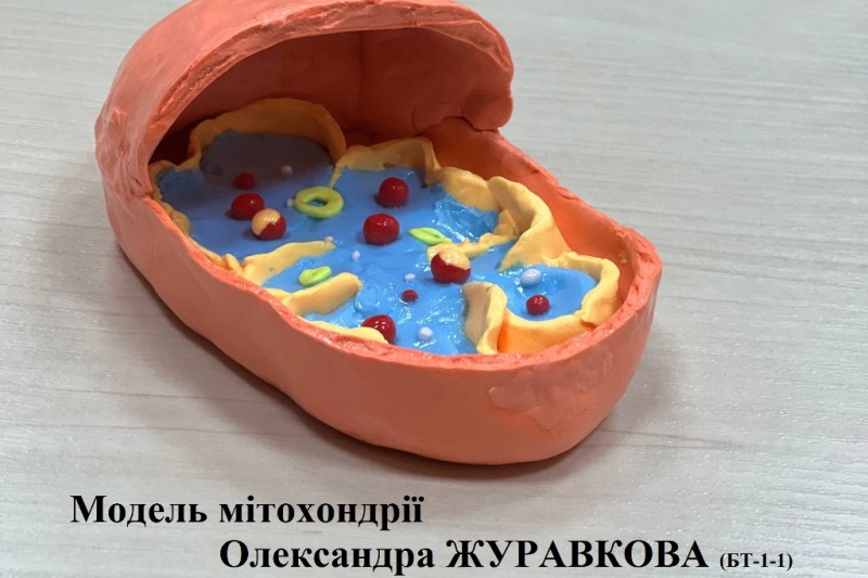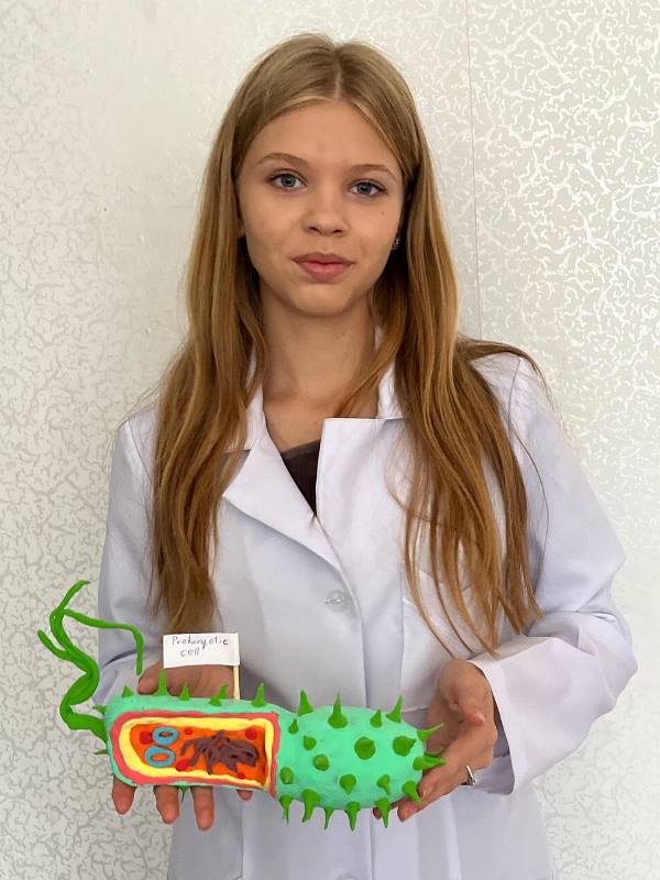 Анжеліка Цвілик (група БТ-2-2) виготовила об’ємну модель прокаріотичної клітини, яка демонструє основні частини бактеріальної клітини: клітинну стінку, цитоплазму, нуклеоїд, рибосоми, а також зовнішні структури – джгутики та війки, що забезпечують рух. Модель допомагає наочно продемонструвати будову прокаріотів і краще її запам’ятати.