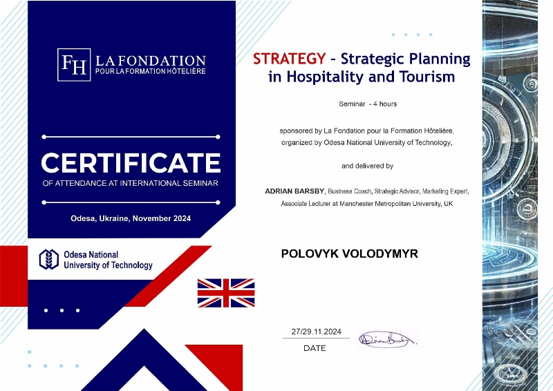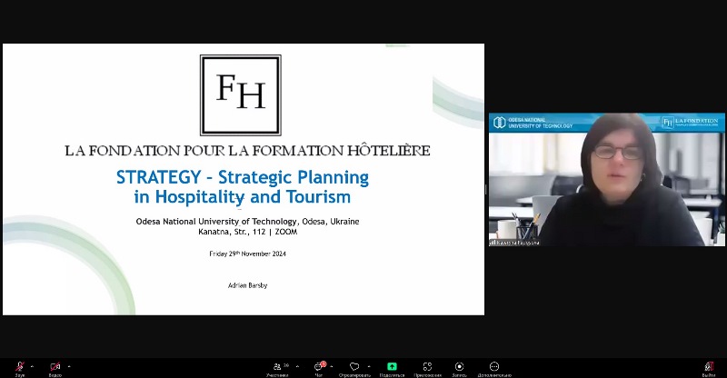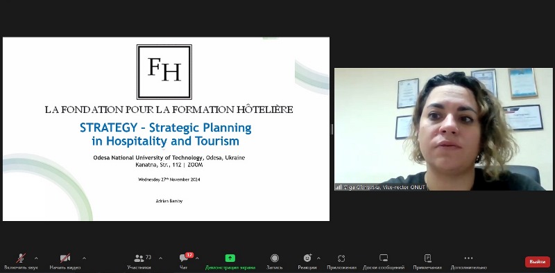 27 та 29 листопада 2024 року викладачі кафедри технології ресторанної і аюрведичної продукції взяли участь у міжнародному семінарі, присвяченому стратегічному плануванню у сфері готельно-ресторанного бізнесу та туризму. Модераторами заходу виступили кафедра готельно-ресторанного бізнесу Одеського національного технологічного університету та La Fondation pour la Formation Hôtelière (Швейцарія).