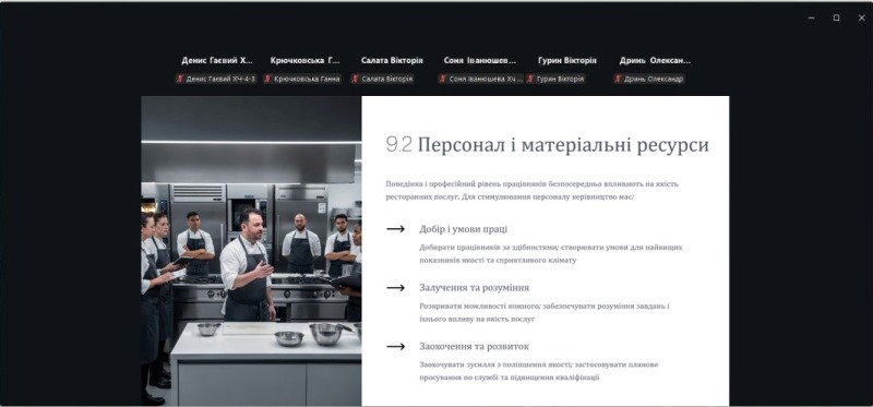 Лекційне заняття мало системний і концептуально вивірений характер і було спрямоване на формування цілісного розуміння багаторівневої моделі управління якістю — від операційного контролю виробничих процесів до стратегічного забезпечення конкурентоспроможності закладів ресторанного господарства. Особливу увагу приділено інтеграції сучасних стандартів якості, принципів безпечності харчових продуктів і практичних механізмів їх реалізації у професійній діяльності.