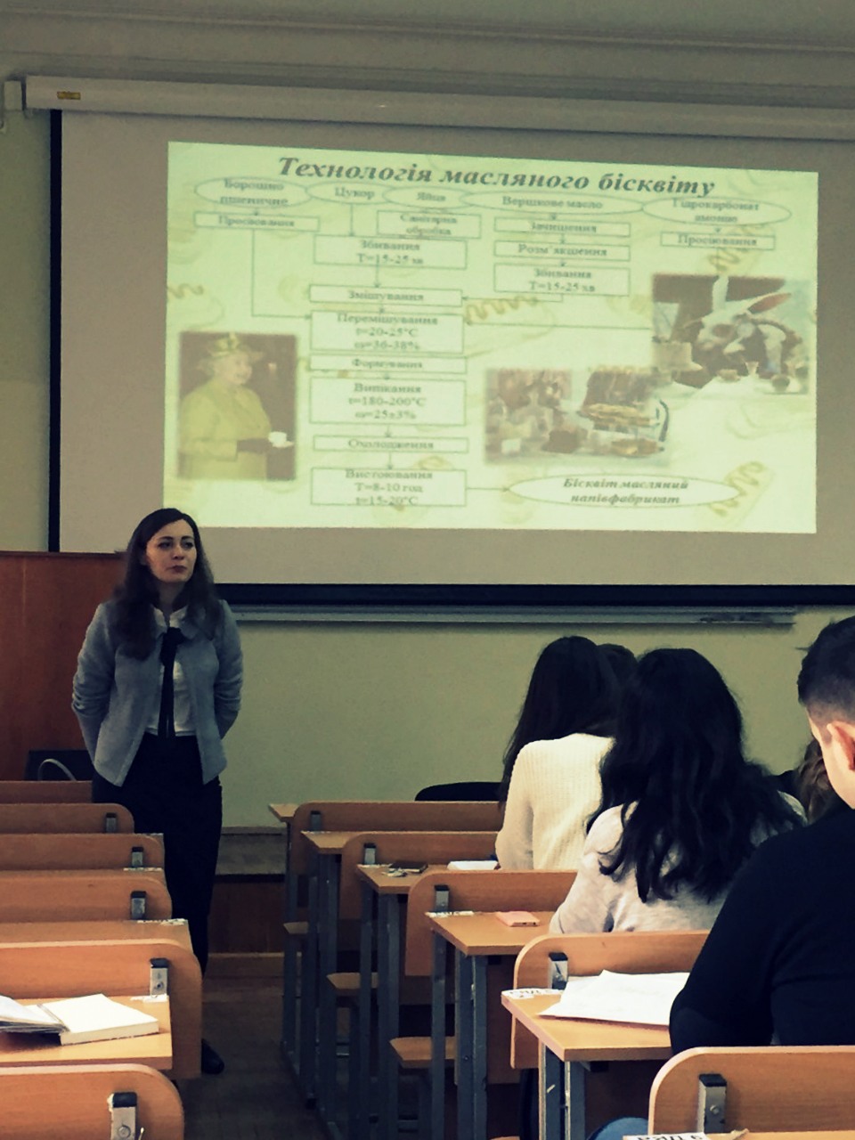 Тема лекції відповідала робочій програмі дисципліни і була присвячена вивченню технологічних особливостей заварного і бісквітного тіста. Викладач у цікавій та доступній для студентів формі продемонструвала вільне володіння матеріалом, стимулюючи студентів до дискусії. Інформація була висвітлена у ракурсі практичного впровадження технології борошняних кондитерських виробів у спеціалізованих закладах ресторанного господарства. Чітко відслідковувався взаємозв’язок із профільними дисциплінами «Устаткування закладів ресторанного господарства», «Управління якістю продукції та послуг ресторанного господарства», «Організація ресторанного господарства». Студенти мали роздатковий матеріал, який скоротив час нотування лекції та поліпшив якість запам’ятовування матеріалу. Лекція супроводжувалась презентацією, оформленою схемами, таблицями, яскравими малюнками.