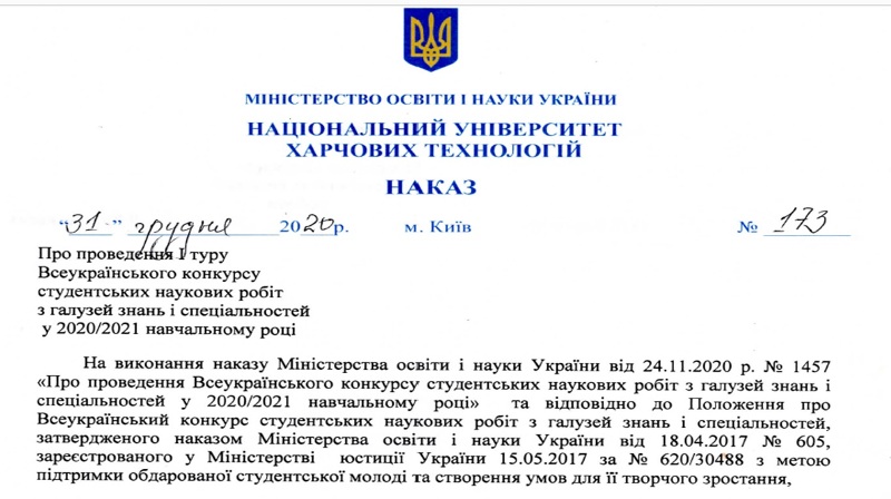 Згідно з наказом по НУХТ №173 від 31.12.2020 р. в університеті відбувся І тур Всеукраїнського конкурсу студентських наукових робіт у 2020/2021 навчальному році зі спеціальності «Харчові технології».