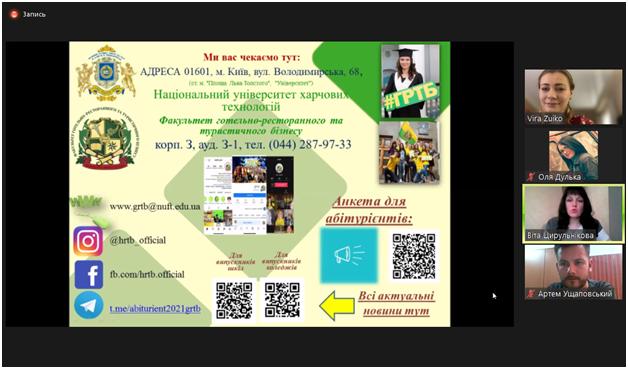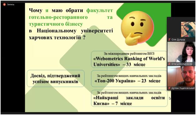 6 листопада адміністрація факультету та колективи випускових кафедр гостинно зустрічали в онлайні учнів шкіл і студентів коледжів зі всієї України, щоб відповісти ствердно на питання: чи варто здобути вищу освіту для успішного працевлаштування в індустрії гостинності у Національному університеті харчових технологій.
