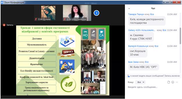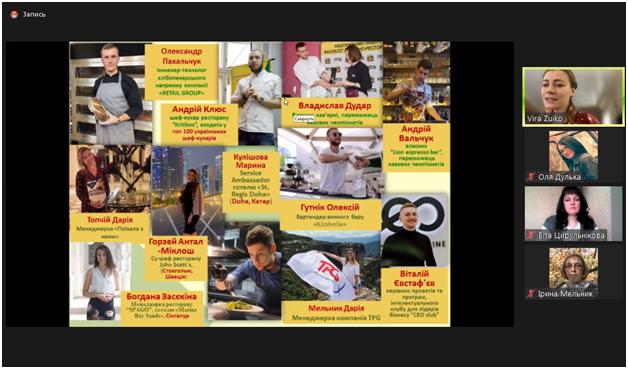 Звісно, найяскравіше представлення навчального процесу, можливостей для професійного, творчого і особистого розвитку в університеті може бути лише від здобувачів вищої освіти. Цього дня в онлайні були «зіркові» студенти, які успішно поєднують навчання з працевлаштуванням за фахом. Алла Запорожан, магістрантка спеціальності «Харчові технології», освітньо-професійної програми «Технології в ресторанному господарстві», випускниця бакалаврату і Коледжу ресторанного господарства НУХТ, шеф-кухарка ресторану «Сто років тому вперед» Євгена Клопотенка і його «права» рука зазначила, що незважаючи на свій практичний досвід, кар’єрний успіх, мріяла здобути вищу освіту другого (магістерського) рівня, а набуті теоретичні знання і практичні навики вважає необхідною умовою для професійного та особистого розвитку.
