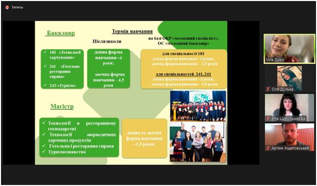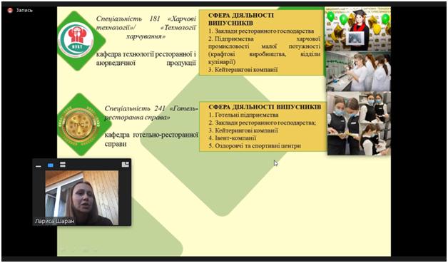 Всебічно презентували спеціальності 241 «Готельно-ресторанна справа», 242 «Туризм», 181 «Харчові технології» та освітні програми, за якими здійснюється підготовка, завідувачки випускових кафедр – Лариса Шаран (готельно-ресторанної справи), Ірина Мельник (туристичного та готельного бізнесу), заступниця завідувачки Віра Зуйко (технології ресторанної і аюрведичної продукції).
