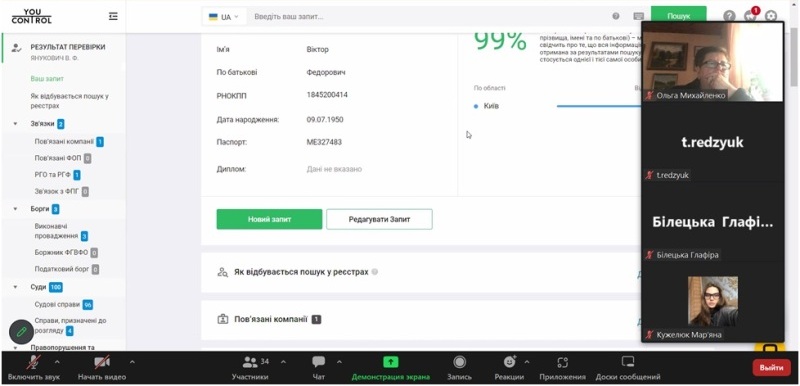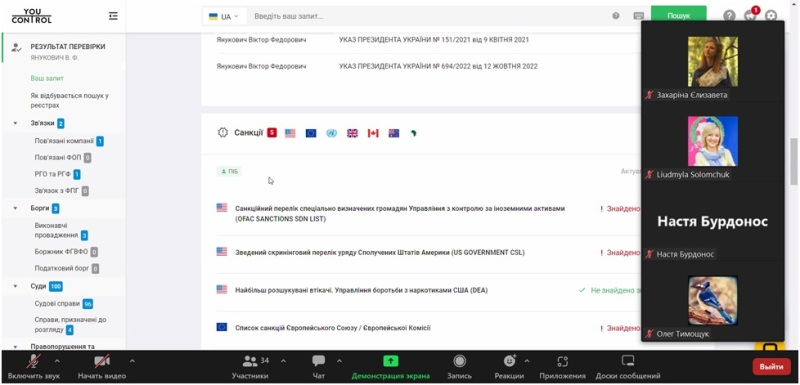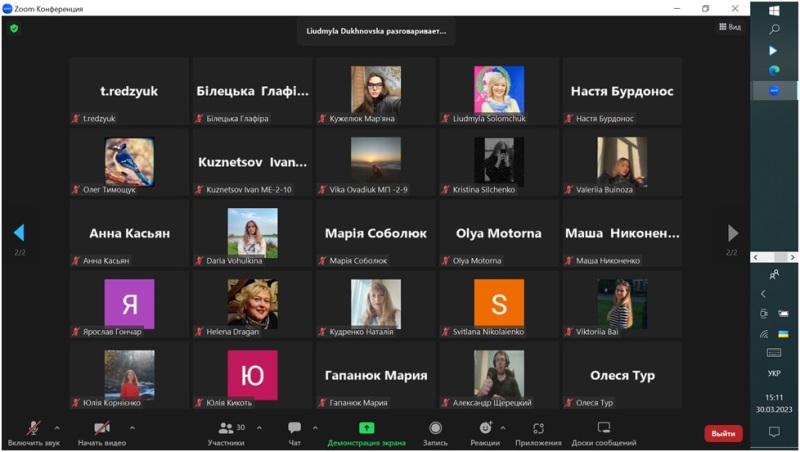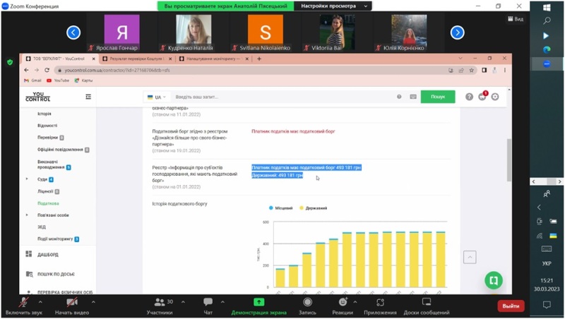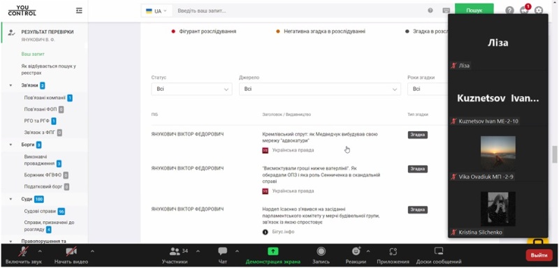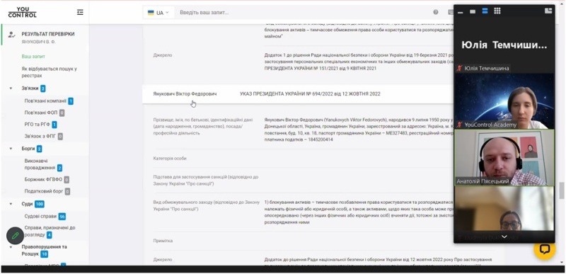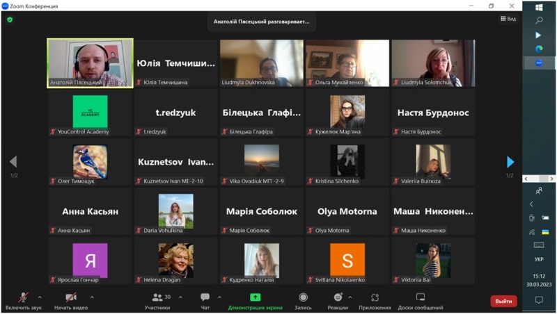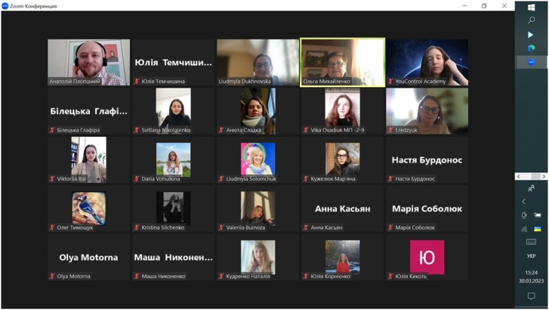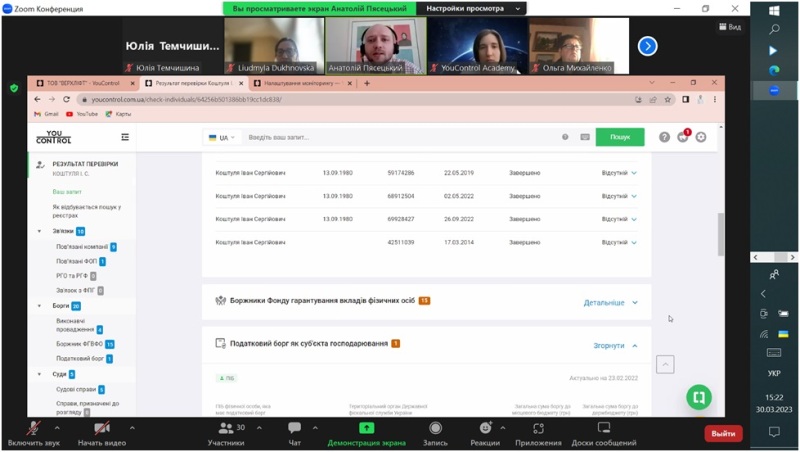 30 березня 2023 року для здобувачів спеціальностей 071 «Облік і оподаткування» і 073 «Менеджмент» Навчально-наукового інституту економіки і управління НУХТ відбулася бінарна лекція «Можливості сервісу YouControl для перевірки фізичних осіб», яку прочитали доцентка Людмила Духновська і запрошений лектор, менеджер освітнього напрямку компанії YouControl Анатолій Пясецький.