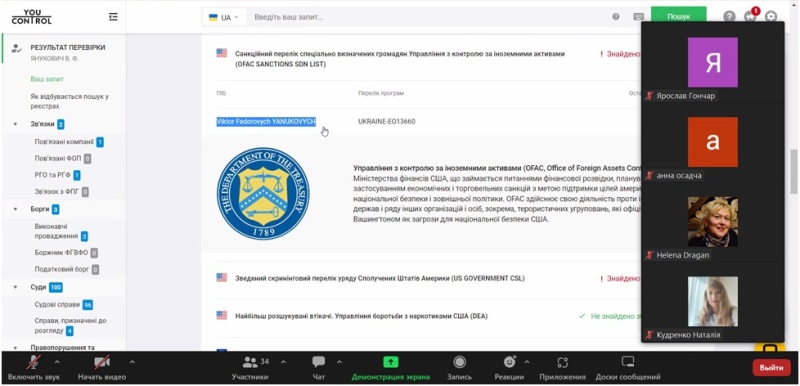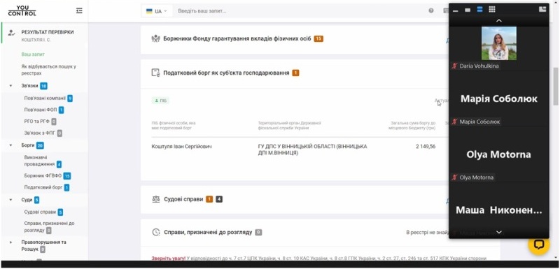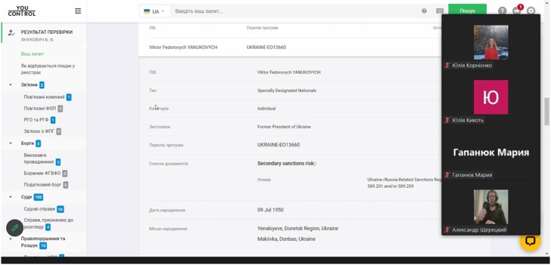 YouControl – аналітична система для комплаєнсу, аналізу ринків, ділової розвідки та розслідувань. Система дозволяє перевірити інформацію та уникнути співпраці з громадянами України та нерезидентами, які: пов’язані з недобросовісними людьми, компаніями та політичними партіями; використовують підроблені документи (паспорти, дипломи); мають борги або інші фактори неблагонадійності; переховуються від органів влади; входять до списку терористів; перебувають у розшуку (МВС і СБУ); мають корупційні правопорушення.
