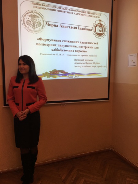 29 грудня 2017 року на засіданні спеціалізованої вченої ради К 35.840.02 Львівського торговельно-економічного університету відбувся захист дисертації на здобуття наукового ступеня кандидата технічних наук асистента кафедри експертизи харчових продуктів нашого університету Анастасії Чорної за спеціальністю 05.18.15 - товарознавство харчових продуктів (науковий керівник - д.т.н., професор Лариса Арсеньєва). Тема роботи - «Формування споживних властивостей полімерних пакувальних матеріалів для хлібобулочних виробів».