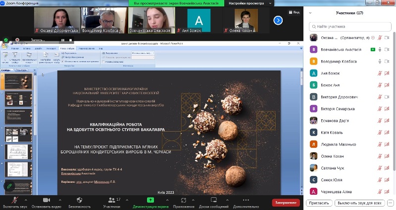 На кафедрі технології хлібопекарських і кондитерських виробів завершилися захисти кваліфікаційних робіт здобувачів освітнього ступеня «Бакалавр» денної форми навчання. Екзаменаційну комісію очолив завідувач кафедри, професор Володимир Ковбаса.
