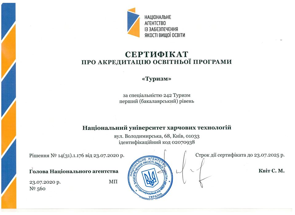 Свої висновки комісія представила експертній раді Національного агентства із забезпечення якості освіти, члени якого на своєму засіданні 23 липня прийняли рішення акредитувати в Національному університеті харчових технологій освітньо-професійну програму «Туризм» зі спеціальності 242 «Туризм» за новими вимогами та правилами відповідно до Положення про акредитацію освітніх програм, за якими здійснюється підготовка здобувачів вищої освіти (номер акредитаційної справи – 0129/АС-20, ID освітньої програми в ЄДЕБО – 2333). «За» проголосували всі 18 присутніх на засіданні членів агентства. Наразі отриманий новий сертифікат про акредитацію.