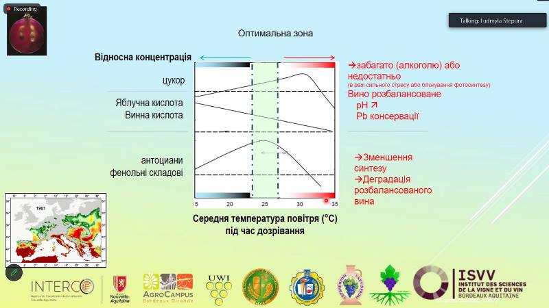 Надзвичайно цікаву та змістовну лекцію «Кліматичні зміни і виноградарство: оцінка впливу та потенційні інструменти для адаптації» прочитали визнані експерти у світі вина – професор, заступник директора ISVV, відповідальний за міжнародні зв'язки, керівник національної програми з підготовки дипломованих енологів, керівник магістратури Еразмус Мундус Вінтур, координатор Міжнародної мережі OENOVITI та головний редактор OENO One Університету Бордо П'єр-Луї Тейсседр і доктор сільськогосподарських наук, інженер-дослідник (екофізіологія та функціональна геноміка лози), заступник директора Bordeaux Grapevine Жан-Паскаль Гутулі.