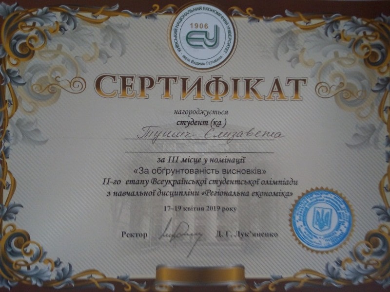 У період з лютого по квітень 2019 року відбулися І та ІІ тури Всеукраїнської студентської олімпіади з навчальної дисципліни «Регіональна економіка». З 17 по 19 квітня 2019 р. на базі ДВНЗ «Київський національний університет імені Вадима Гетьмана» відбувся ІІ етап, у якому брали участь наші другокурсниці спеціальності 051 «Економіка» (освітньо-професійна програма «Економіка підприємства») Дарина Грабарчук і Єлизавета Тушич.