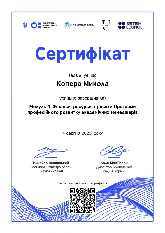 Отримані сертифікати підтверджують не лише успішне проходження модуля, а й готовність команди ініціювати зміни в управлінських підходах і сприяти розвитку нової культури лідерства в університетському середовищі.