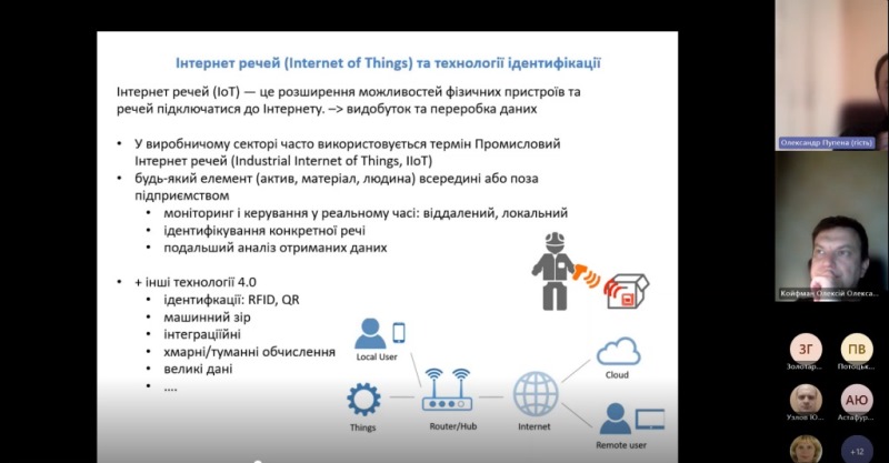Наш фахівець зробив загальний огляд концепції Industry 4.0., обговорив зі слухачами сутність інновацій, зокрема в контексті автоматизації процесів виробництва на базі Інтернету речей, а також важливість зміни в культурі та організації виробництва. Викладач розповів про зміну парадигми в промисловому виробництві та інфраструктурі, що з одного боку спричинено можливостями сучасних технологій, які прийнято відносити до драйверів Індустрії 4.0, а з іншого боку викликами, пов’язаними з постійними змінами та збільшеними вимогами. Лектор зазначив, що зараз є стійка тенденція до гіперперсоналізації продуктів чи сервісів на основі вимог клієнта, максимізації ROCE та гнучкості в організації роботи. На його думку, у гірничо-металургійному комплексі такі інноваційні зміни в контексті цифрової трансформації є необхідними, зокрема, це стосується впровадження стимулюючих технологій I4.0. І для цього потрібно формувати чітку цифрову стратегію, розвивати культуру та лідерство у цьому напрямку. Також експерт НУХТ детальніше розповів про промисловий Інтернет речей (IIoT), зокрема хмарні технології, ідентифікації RFID і QR, моніторинг та керування в реальному часі, збір та аналітику отриманих даних тощо. Він зазначив, що завдяки IoT автоматизація виробництва набуває інтелектуальної складової, реагуючи на зміни в реальному часі для досягнення оптимальних результатів.