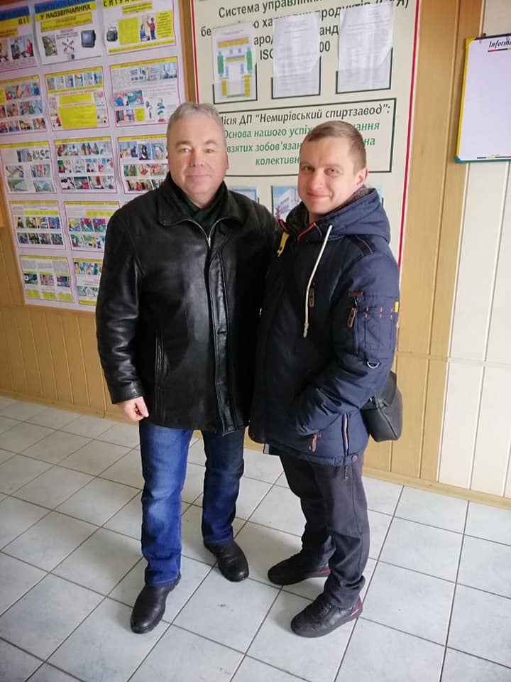 У цих питаннях наші фахівці тісно й плідно співпрацюють із виробничниками. На провідних підприємствах галузі вони апробують результати свої наукових пошуків. Тож днями доцент кафедри Юрій Булій побував на Немирівському спиртовому заводі (ТОВ «ЛВН «ЛІМІТЕД»), де зустрівся з головним технологом Ярославом Боярчуком (донедавна – також викладач кафедри) і директором заводу Павлом Солдатенковим.