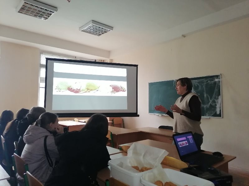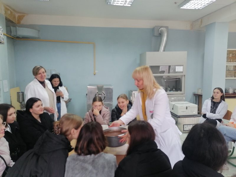 Після закінчення майстер класу з виробництва еклерів ліцеїстів щиро зустрічали фахівчині кафедри технології молока і молочних продуктів – директорка інституту, професорка Оксана Кочубей-Литвиненко, завідувачка кафедри, професорка Галина Поліщук, доцентки Тетяна Осьмак, Ульяна Бандура і Оксана Басс. Тут учні дізналися про молочну галузь, виробництво морозива: його класифікацію, асортимент, традиційні і авторські види. Вони взяли участь у цікавій вікторині, під час якої отримували смачні подарунки за правильні відповіді – морозиво у формі гарбузиків.