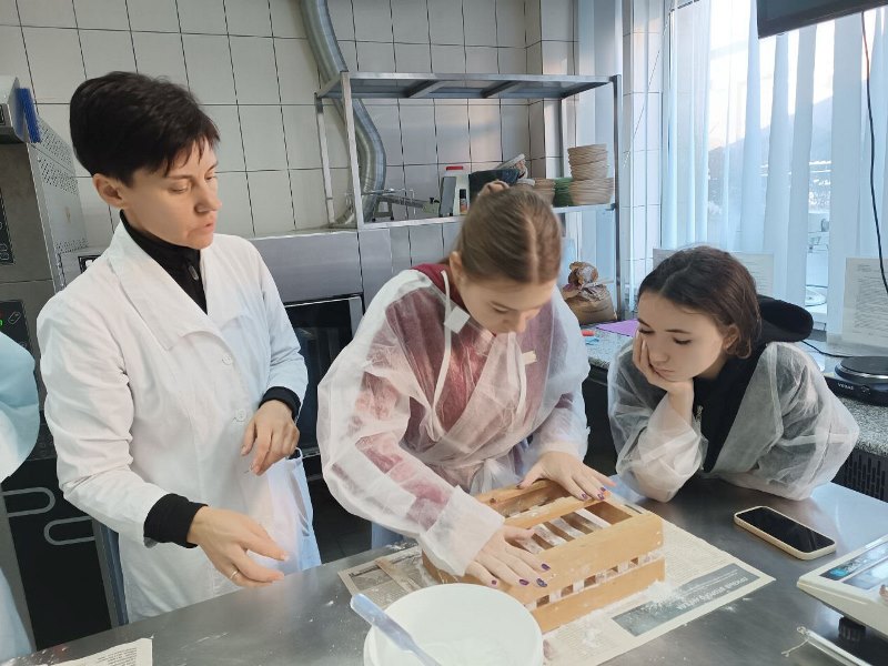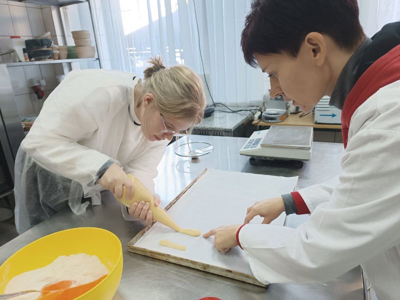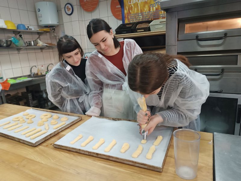Продовжили навчання гості на кафедрі технології хлібопекарських і кондитерських виробів, де їх гостинно зустрічала доцентка Олена Кохан, яка поділилася секретами виробництва заварного напівфабрикату для тортів і тістечок на майстер-класі «Загадковий еклер». Разом у лабораторії вони відпрацювали всі аспекти технології еклерів, випекли запашні напівфабрикати, оцінили їх органолептичні показники.