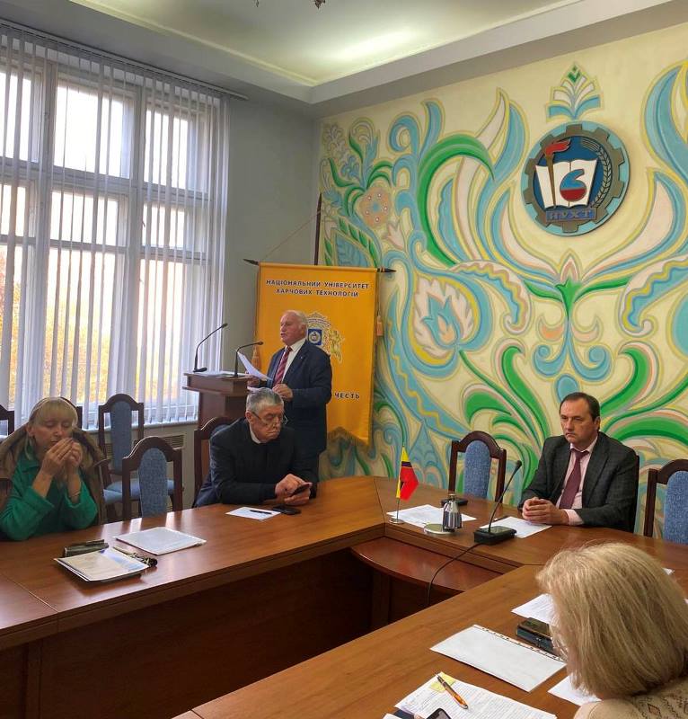 Розпочали з приємного – привітали колег, що відзначили дні народження між засіданнями, та ректор, професор Олександр Шевченко вручив нагрудний знак «Відзнака Національного університету харчових технологій» завідувачу кафедри машин і апаратів харчових та фармацевтичних виробництв, професору Олександру Гавві і диплом доктора наук доценту кафедри технологічного обладнання та комп’ютерних технологій проєктування Віталію Пономаренку.