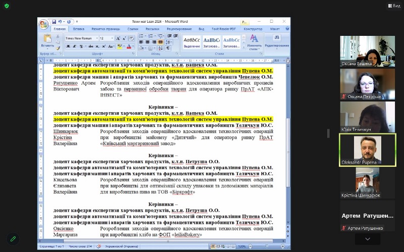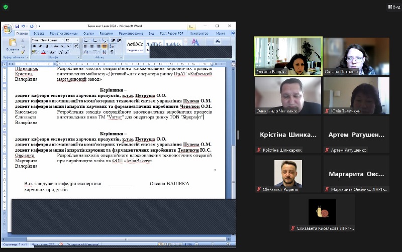 На кафедрі експертизи харчових продуктів відбулася зустріч здобувачів міждисциплінарної освітньої програми «Lean-виробництво харчової продукції» та керівників випускових кваліфікаційних робіт. Фокусним питанням заходу було обговорення тем магістерських робіт, зміст і коло завдань, на вирішення яких вони орієнтовані. Особливим підходом випускової роботи за освітньою програмою «Lean-виробництво харчової продукції» є комплексний розгляд окресленої проблеми та розроблення заходів з її вирішення на межі трьох спеціальностей – 181 «Харчові технології», 174 «Автоматизація, комп’ютерно-інтегровані технології та робототехніка», 133 «Галузеве машинобудування».