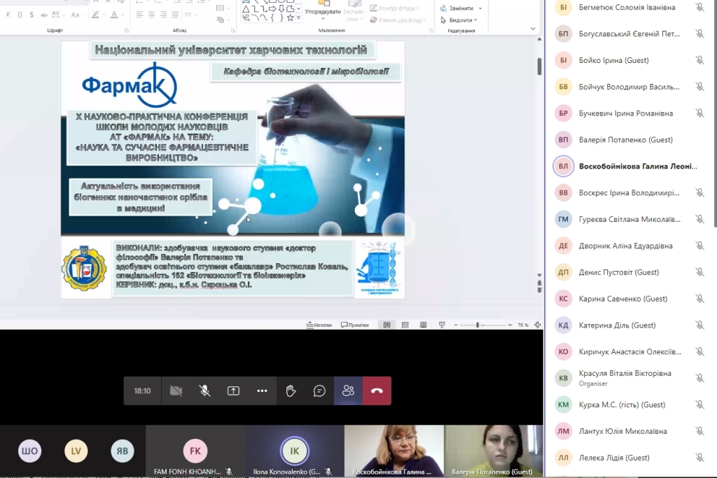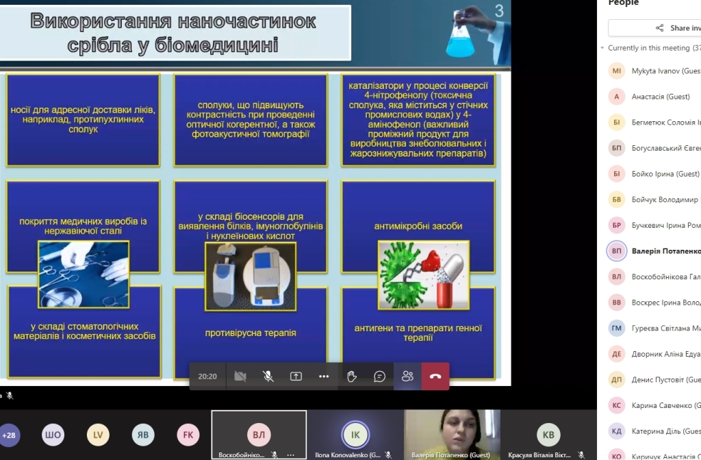 Валерія Потапенко та Ростислав Коваль представили доповідь щодо широкого використання наночастинок срібла (AgNPs) в медицині, способів їх отримання, а також притаманних їм властивостей. Так, AgNPs використовуються у противірусній терапії, у складі біосенсорів, як антимікробні засоби, як носії для адресної доставки ліків, у складі стоматологічних матеріалів і косметичних засобів, як покриття медичних виробів із нержавіючої сталі, як антигени та препарати генної терапії. Крім того, були висвітлені результати наукової роботи, де пошукачі отримували наночастинки срібла за допомогою дріжджів на базі лабораторій кафедри біотехнології і мікробіології.