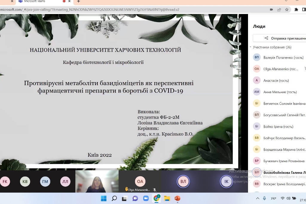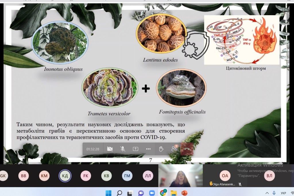Владислава Лозіна робила доповідь «Противірусні метаболіти базидіоміцетів як перспективні фармацевтичні препарати в боротьбі з COVID-19». У ході її дослідження була розглянута можливість використання біологічно активних речовин виділених із вищих грибів для створення безпечних, високоефективних і широкодоступних препаратів і методів лікування коронавірусної хвороби. Численні дослідження показують, що їстівні гриби можуть бути ефективними проти SARS-COV-2, оскільки поліпшують імунну відповідь організму, в той час як основною проблемою COVID-19 є зниження регуляції імунної системи. В результаті було приведено порівняльну характеристику біологічно активних речовин базидіоміцетів та механізмів їх дії. Було встановлено, що метаболіти базидіоміцетів родів Ganoderma, Auricularia, Flammulina, Lentinus, Lignosus, Inonotus, Trametes та Fomitopsis мають широкий спектр противірусної дії і є перспективною основою для створення профілактичних та терапевтичних засобів проти COVID-19.