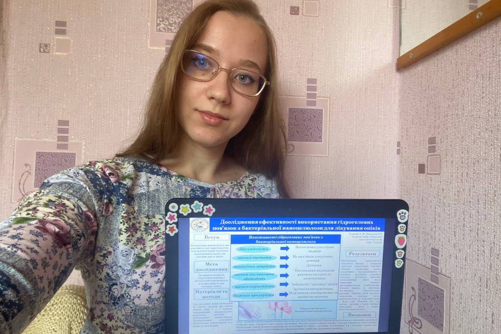 Анастасія Роженко представила постерну доповідь, що стосувалася отримання наноцелюлози, яку використовують для лікування опіків. Аналізуючи літературу було показано біофізичні характеристики бактеріальної наноцелюлози та ефективність гідрогелевої пов'язки на її основі при лікуванні опіків. Встановлено, що її застосування забезпечує ефективне загоєння та очищення опіків. Також було проведено порівняння впливу різних концентрацій розчинів NaOH (1%, 5%, 10%) на синтезовані гідрогелеві плівки з метою вибору оптимальної концентрації лугу для їх очищення від залишків середовища та бактерій. Високі концентрації NaOH негативно впливали на механічну міцність плівок, тому з метою зменшення негативної дії лугу обрано найменшу його концентрацію (0,5-1%).