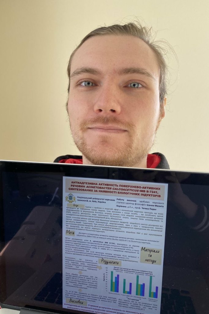 Метою постерної доповіді Микити Іванова було дослідження впливу біологічних індукторів на синтез практично цінних поверхнево-активних речовин на гліцерині різної якості. У ході лабораторних досліджень були виявлені закономірності з регуляції антиадгезивних властивостей поверхнево-активних речовин щодо бактеріальних і дріжджових тест-культур за рахунок внесення у середовище культивування продуцента біологічних індукторів.