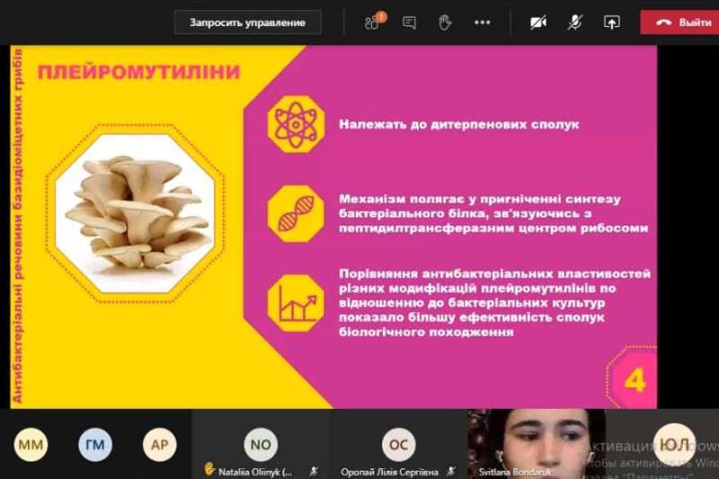 Далі виступали магістранти першого року навчання. Робота Світлани Бондарук і Аліни Кернер «Антимікробні речовини базидіоміцетних грибів як альтернатива антибіотикам» зацікавила можливістю використання антимікробних речовин грибів у складі косметичних і лікарських засобів місцевого застосування.
