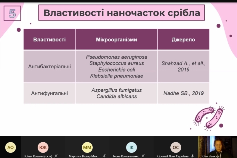 Присутніх зацікавила доповідь Юлії Лазюки «Антибактеріальні та антифунгальні властивості біогенних наночасток селену», що стосувалася можливості отримання наночасток металів із використанням бактеріальних клітин, а також їх біологічних властивостей.