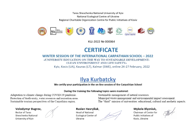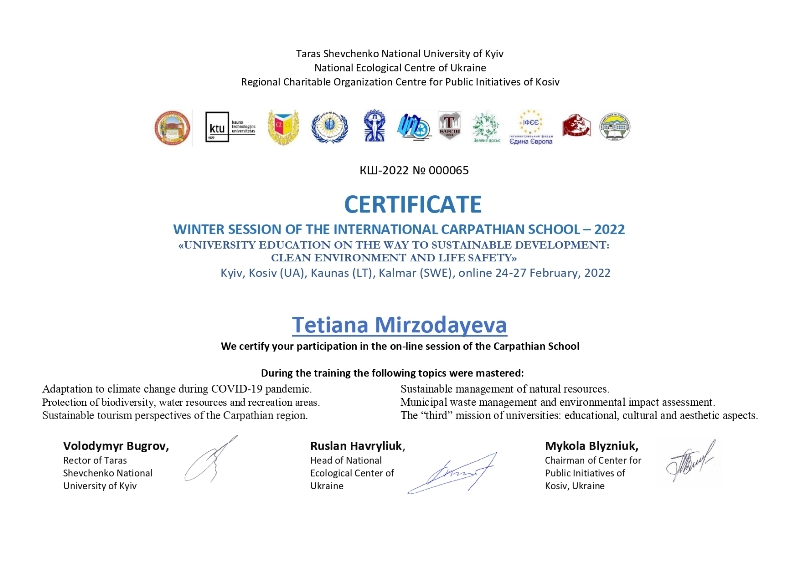 Напередодні повномасштабного вторгнення російської армії на територію України здобувачі магістерської програми спеціальності «Туризм» готували тези до участі у зимовій сесії Міжнародної Кapпaтcькoï Школи «Університетська освіта на шляху до сталого розвитку: чисте довкілля і безпека життєдіяльності», запланованої для проведення на 24-27 лютого 2022 року. Захід мав на меті висвітлення нової глобальної політики «зеленого» курсу Євросоюзу та сталого розвитку гірських територіальних громад України. Учасникам пропонувалися цікаві тематичні напрями: «Адаптація до кліматичних зміну період COVID-19», «Захист біорізноманіття, водних ресурсіві зон рекреації», «Туристична перспектива сталості Карпатського регіону», «Стале управління природними ресурсами гірських екосистем», «Відходи споживання та оцінка ïx впливу на стан довкілля», «Третя місія університетів – освітні, культурні та мистецькі аспекти».